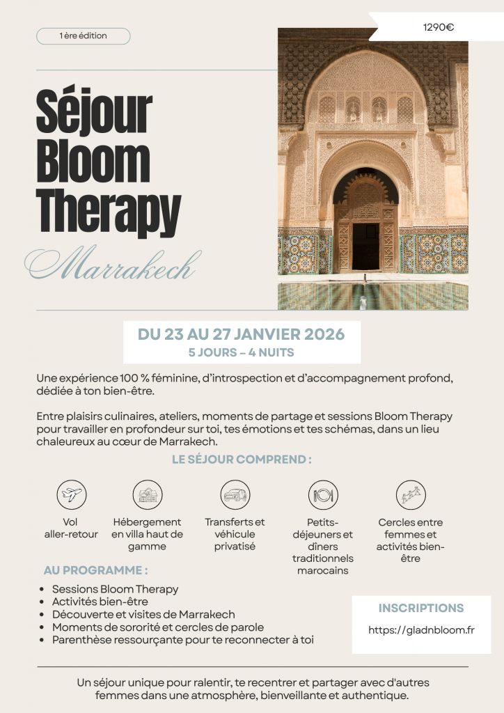 Merci de remplir ce questionnaire afin que nous puissions adapter au mieux votre expérience durant le séjour 1. Informations personnellesPrénom *Nom de famille *Âge *Email *2. Objectifs et attentesAvez-vous des attentes ou objectifs particuliers par rapport à ce séjour Bloom Therapy ? *3. Ateliers Art Therapy – Glad & BloomAvez-vous déjà participé à un atelier Art Therapy – Glad & Bloom ? *OuiNonSi oui, précisez l’atelier (art floral, céramique, peinture ou autre) : *4. Questions et commentairesUtilisez cet espace pour vous exprimer, poser des questions ou partager tout avis ou besoin particulier : *5. Antécédents thérapeutiquesAvez-vous déjà consulté un psychiatre, psychothérapeute, thérapeute ou autre professionnel de santé mentale ? *OuiNonSi oui, précisez : *Suivez-vous actuellement un traitement médical ? *OuiNonSi oui, précisez le type de traitement et les éventuelles contraintes : *6. Allergies / Besoins alimentaires spécifiquesAvez-vous des allergies / besoins alimentaires spécifiques ? *OuiNonSi oui, précisez : *7. Contact en cas d’urgenceNom et prénom *Lien avec vous : *Téléphone whatsapp avec l'indicatif pays *Merci d’avoir pris le temps de remplir ce questionnaire. Vos réponses nous aideront à rendre votre séjour Bloom Therapy encore plus agréable et épanouissant. 🪷Envoyer